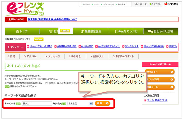 おしゃべり広場トップページに以前注文いただいた商品が表示されます。ここから、おすすめコメントの投稿やお気に入り登録ができます。おいしかった商品をおすすめしたり、お気に入り登録しませんか!