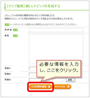 参加しているコミュニティのトップページから、「トピックを作成」または「イベントを作成」をクリックします。 ※みんなが気持よく利用できるように、投稿ルールを必ずご確認ください。 →詳しくはこちら