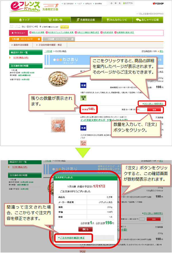 ほしい商品の数量を入力し、「注文」ボタンをクリックしてください。