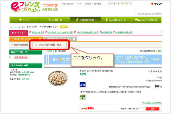表示されている商品のなかから、変更したい商品の数量を入力し、「修正」をクリックすると、注文点数の変更が完了します。