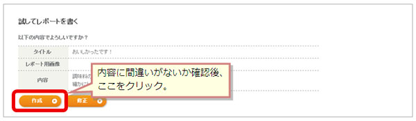 レシピ写真の下部にある、「試してレポートを書く」ボタンをクリックします。