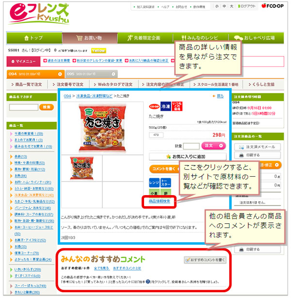 ※お買い物ページのトップには、その週に注文締め切りのカタログの特集が表示されています。 特集で紹介している商品を注文する場合は、「注文」ボタンをクリックしてください。 商品の詳細情報を見たい場合は、商品名か写真をクリックすると詳細情報が表示されます。