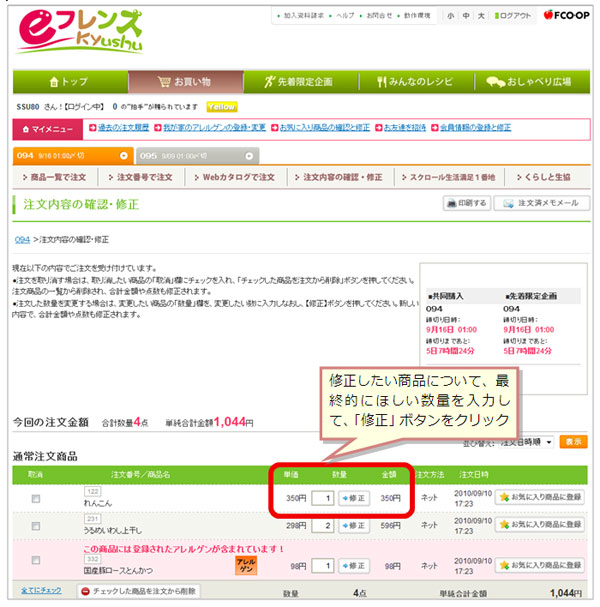 注文した商品の数量を変更する場合は、画面右の「注文内容の確認・修正」ボタンを押し、「注文内容の確認・修正」ページで修正してください。